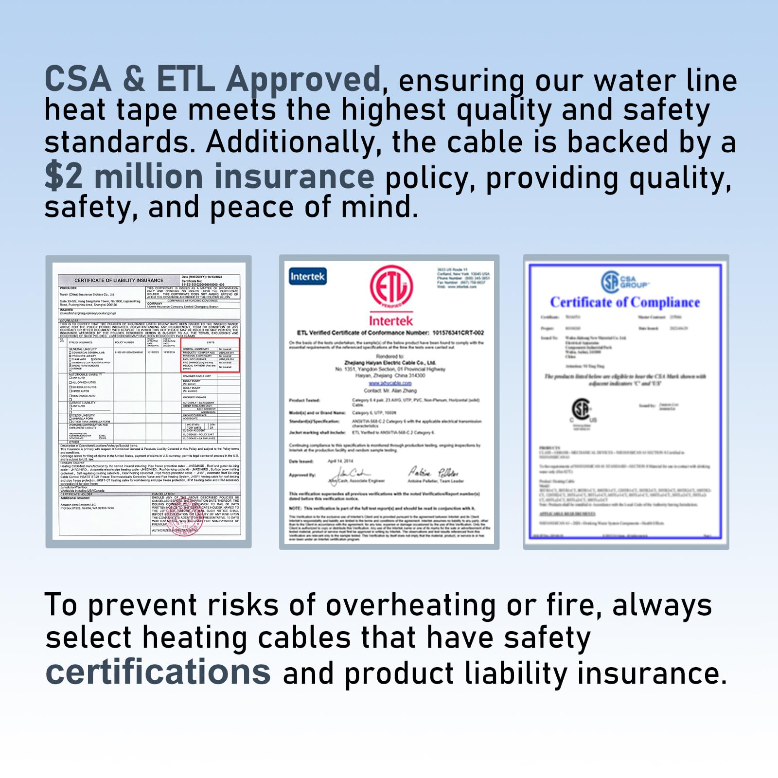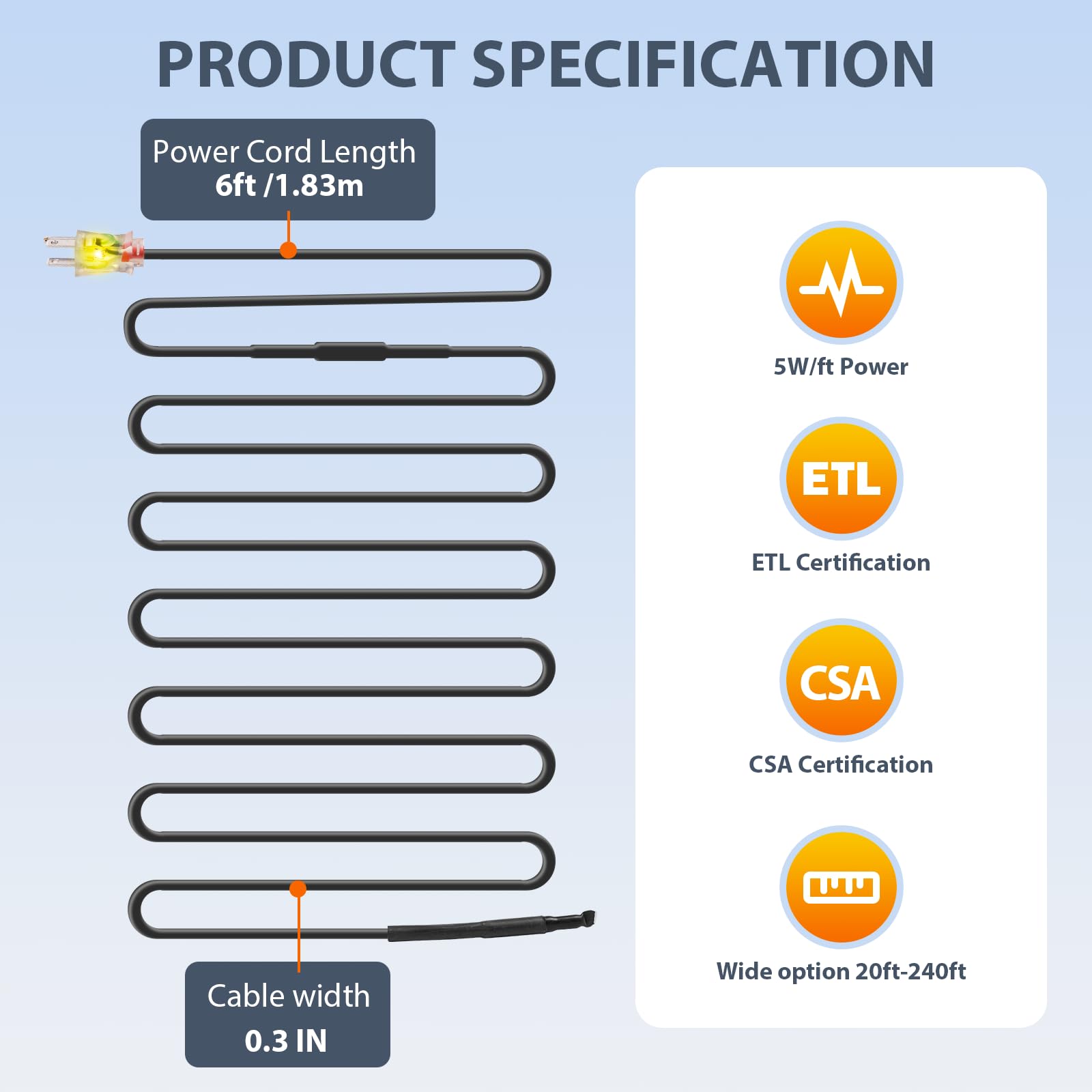 - Both CSA and ETL approved. 6 ft 18/3 cold lead with plug ; 5 watts/ft. Pre-assembled, ready to install, no maintenance required; Easy instruction manual, clips and spacers are included.