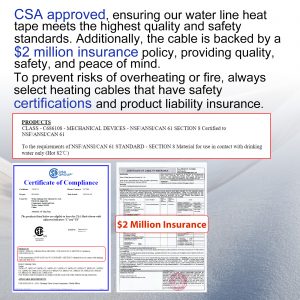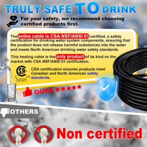 - [CSA NSF61 Certified for Drinking Water Safety] The entire heating cable is CSA NSF61 certified, one of the most authoritative safety certifications in North America. It is the only fully certified product on the market, ensuring your water remains safe to drink while protecting pipes from freezing.
