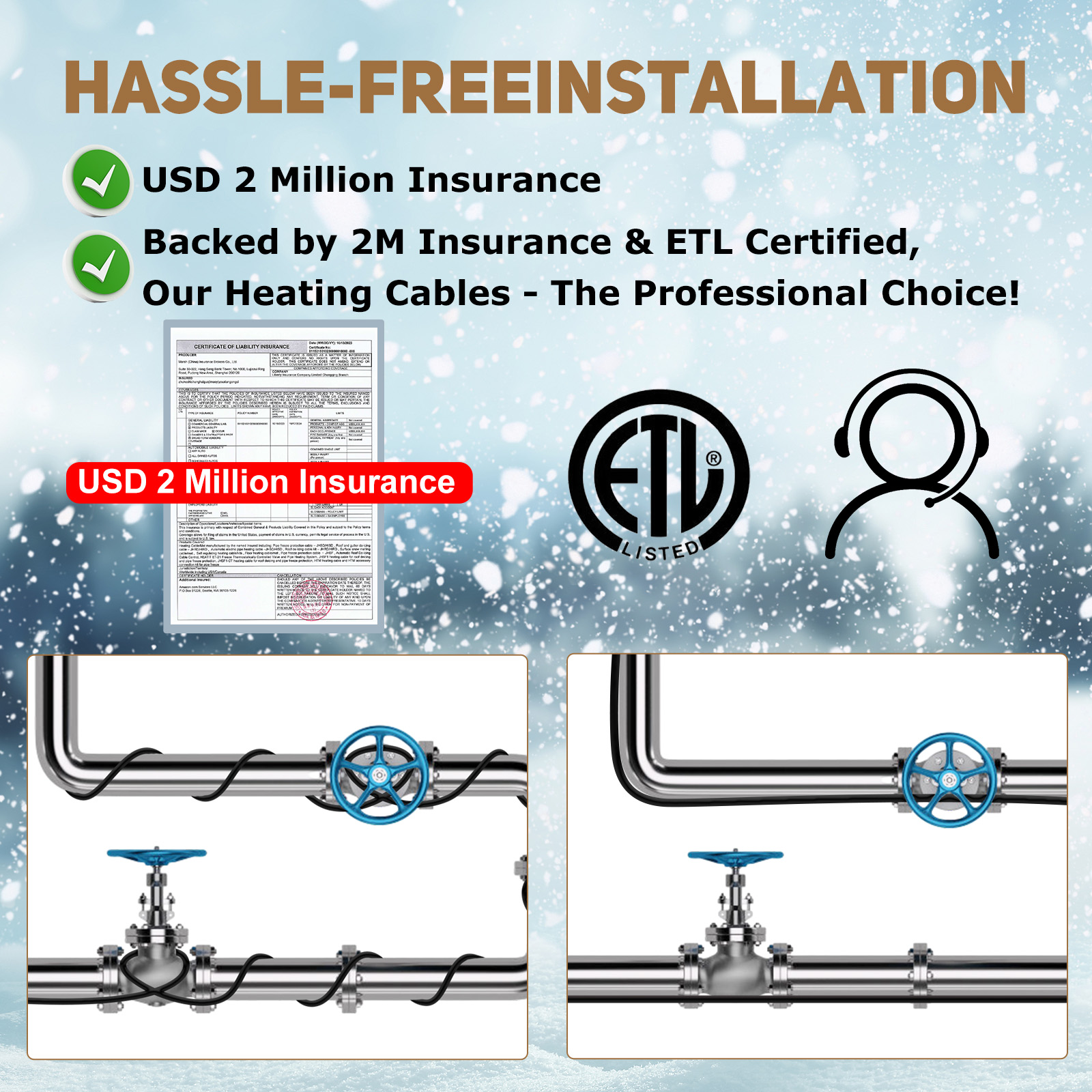 - 【ETL Certified for Superior Safety】ETL certification, trusted in North America, ensures safety and quality compliance with rigorous standards. Our self-regulating heating cable holds full ETL certification, guaranteeing exceptional performance and reliability. The plug is also UL certified for extra safety. Always choose a fully certified heating cable for true safety. Plug-only certification is insufficient; the entire cable must be certified.