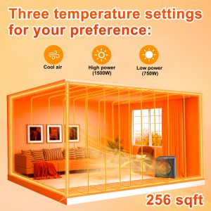 - 【Automated Temperature Control】Intelligently detects the required heating and air circulation levels to maintain preset temperatures, eliminating the need for manual adjustments and ensures an efficient heating experience. Offering two noise-free heating settings (Low/750W, High/1500W) and the option for fan-only operation to customize the heat output and optimize energy consumption.